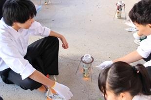 「サバ飯づくり」では、空き缶二個を組合せ、牛乳パックの容器を燃料にしてご飯を炊き、身の周りにあるもので簡単にカレーが作れることを学びました。