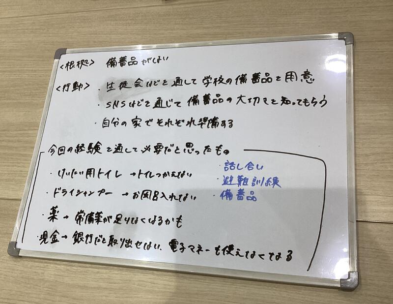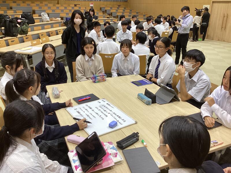 本校生徒は、大学院生と一緒に防災備蓄について検討したり、各自の課題研究についてアドバイスをもらったり、とても有意義な時間を共有することができました。