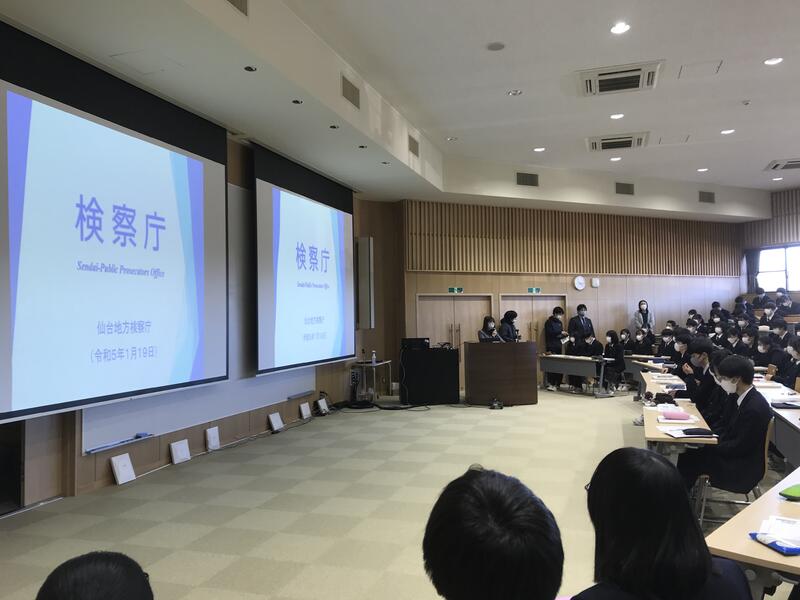 令和5年1月19日(木)7校時,シチズンシップ教育の一環として,1年生を対象にした「裁判制度に関する講座」を開催しました。今回は,仙台地方検察庁より宮尾友里恵様を講師にお迎えし,検察庁の組織や仕事内容に関すること,事件発生から起訴に至るまでの流れ,そして「裁判員制度」の仕組み等についてお話をいただきました。