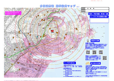 本校生徒が入学後最初に行う防災学習はLHRで行う「通学防災マップ」作成です。ピンクで示した津波浸水域が記載された地図に、自分たちの通学路を朱書きします。この地図は2枚作成し,1枚は学校で保管、非常時に帰宅許可を出す判断材料に使います。もう1枚は家庭に持ち帰らせ危険箇所はどこか、また、もしものときの集合場所も記入し、家族で共有するよう指導しています。この地図には土砂災害危険地域も表示されており,通学路にあるリスクを知らせます。