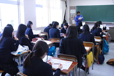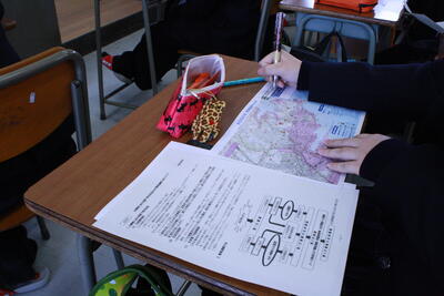 講師に八千代エンジニヤリング株式会社の寺脇氏をお招きし,2学年全員に授業を行っていただきました。昨年の西日本豪雨災害や多賀城市で発生した過去の災害やハザードマップ,洪水・土砂災害などについて学んだ後,グループごとにDIGに挑戦しました。設定や地図を踏まえながら,どのように避難をすれば良いかを考えることができました。