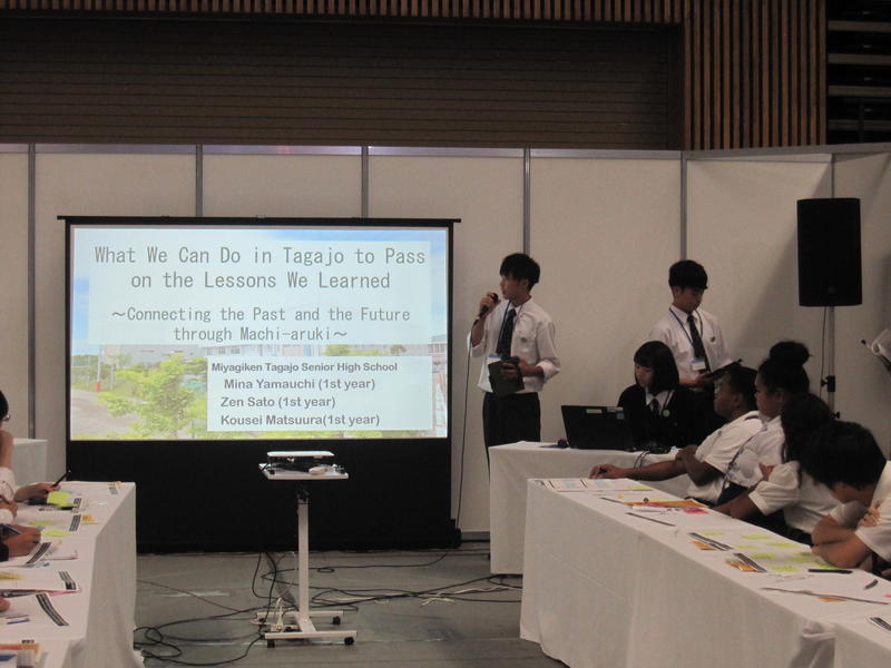 私は,今回の津波サミットで「津波が来る前」と「津波が来たあと」の2つの行動について考えました。「津波が来る前」では沿岸地域のハザードマップの作成を,発災前に危険箇所や避難場所の確保などを行うという結論に至りました。「津波が来たあと」では情報共有のため,若者はSNSによる情報の確認,高齢者へはTV・ラジオ・新聞で情報の確認をして,デマを防いで安全に避難させるという結論に至りました。また,今回の開催地は北海道であり,これまで数多くの自然災害が発生してきたところです。私たちは東日本大震災で,都市型津波によって実際に被害を受けた多賀城市にある高校として津波の恐ろしさなどをしっかりと他県・他国の人に発表することができました。ほかにも,私自身は海外に行ったことがなく,外国人と英語で話す経験をほとんどしたことがなかったので,外国の高校生と話してみて,自分の英語力を上げるきっかけにもなりました。今回の貴重な体験を今後の活動に活かしていきたいです。