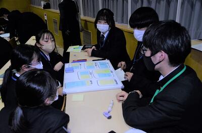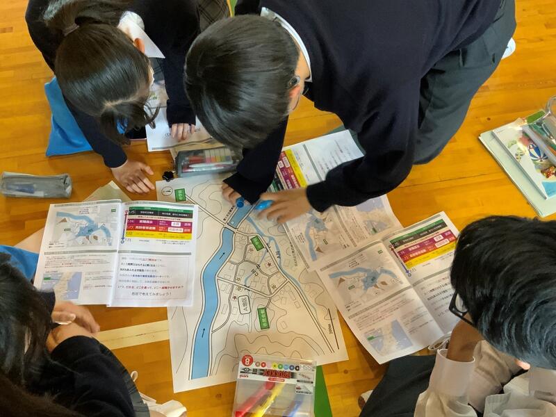 今回のDIGでは、架空の地域の地図を用いて、過去にそこで起こった豪雨災害時の浸水状況の情報を与え、過去に起こった豪雨災害よりも多い雨が降るという予報が出ているという想定で、地図上のどこに住民を避難させるかということを行いました。1グループ4~5人で自分の意見を出し合って、合意形成を図り、避難場所や避難ルートなどを考えていました。各グループの考えを他のグループと発表しあうことにより、より深い学びになったと思います。