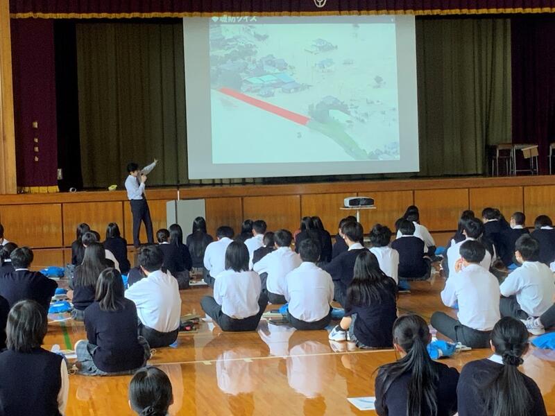 1日目は,開会行事の後に,参加校の学校紹介や東北大学災害科学国際研究所の佐藤健教授による基調講話,そして参加者によるグループワークが行われました。そして2日目には体育館を会場にしたポスターセッション(全78題)を行い,午後には本校災害科学科の生徒がナビゲートする「津波伝承まち歩きツアー」が行われました。