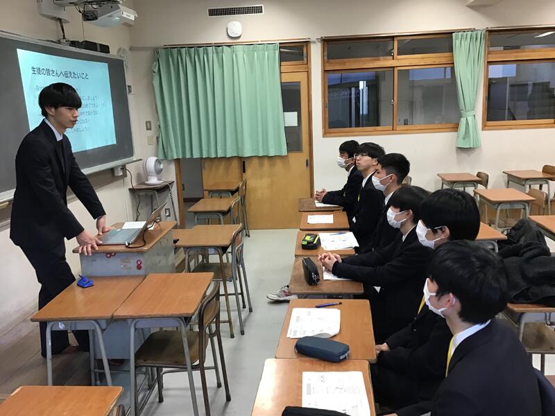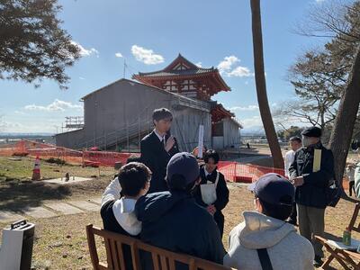 2月16日、本校に東北学院大学生、東北学院大学関係者、多賀城市役所職員の方々にお越しいただきました。多賀城市と奈良市は友好都市であり、そこで開催された「東アジア・サマースクール」に東北学院大学の学生1名が多賀城市からの推薦により参加したそうです。