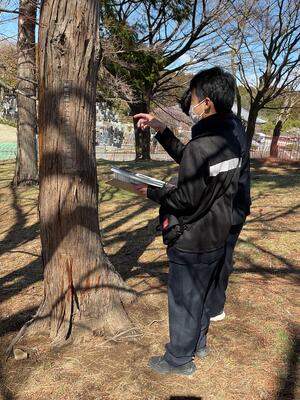 今回は春をテーマにした俳句を読むとのことでしたが、冬の名残が多く残っており、春っぽい句を詠むのが中々難しかった印象でした。松ぼっくりや枯葉、壺の碑と、季節を感じさせるような風景囲まれながらも、中々言葉を浮かばせることが出来ず、半分はプロの方の助言で一句仕上げた次第です。自然と密接により一体化できるようなこのイベントには是非次も参加し、自然についての自分の価値観を探求していきたいと思いました。 (語学研究部3年 寺島 祥)