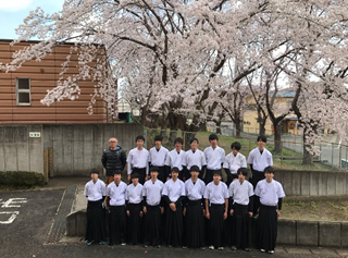 多賀城市体育館弓道場で活動しています(写真:弓道場脇にある満開の桜の木の下で)