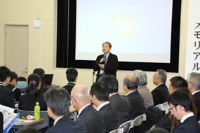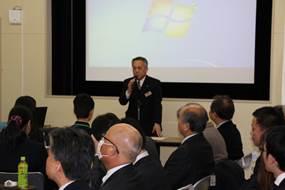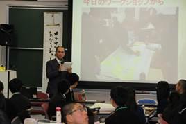 写真 ワークショップのまとめとして野澤令照宮城教育大学教授からコメントをいただきました。ワークショップでの視点の的確さをどのグループについても褒めていただき,さらには宮城県内で被害が少なかった事例や復興において良い事例などの紹介などもありました。地域コミュニケション力の向上や高校生,中学生が持っている力の活かしかたなどについて助言をいただきました。