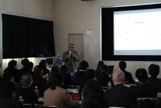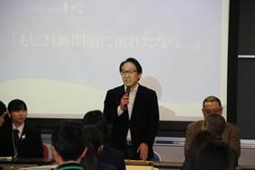 写真 東北大学災害科学国際研究所佐藤健教授から「DRRの実現に向けて高校生に期待すること」の講演がありました。講演では災害を数値化する自然科学的なアプローチ,地域を学ぶことが防災・減災につながるとといった社会科学的なアプローチの話をいただき,まさに防災・減災は文理融合型のアプローチが必要であることの話がありました。