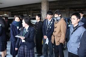 昼食後,県外からの参加者を中心に多賀城高校生徒がガイドする被災地案内を行いました。バスの車窓から七ヶ浜町の国際村や仮設住宅,そして菖蒲田浜の防波堤などを見学しました。その後,イオン多賀城店で一行は下車し,iPadを用いた当時の映像,画像と合わせながら,波高標識を辿る「まち歩き」を行いました。